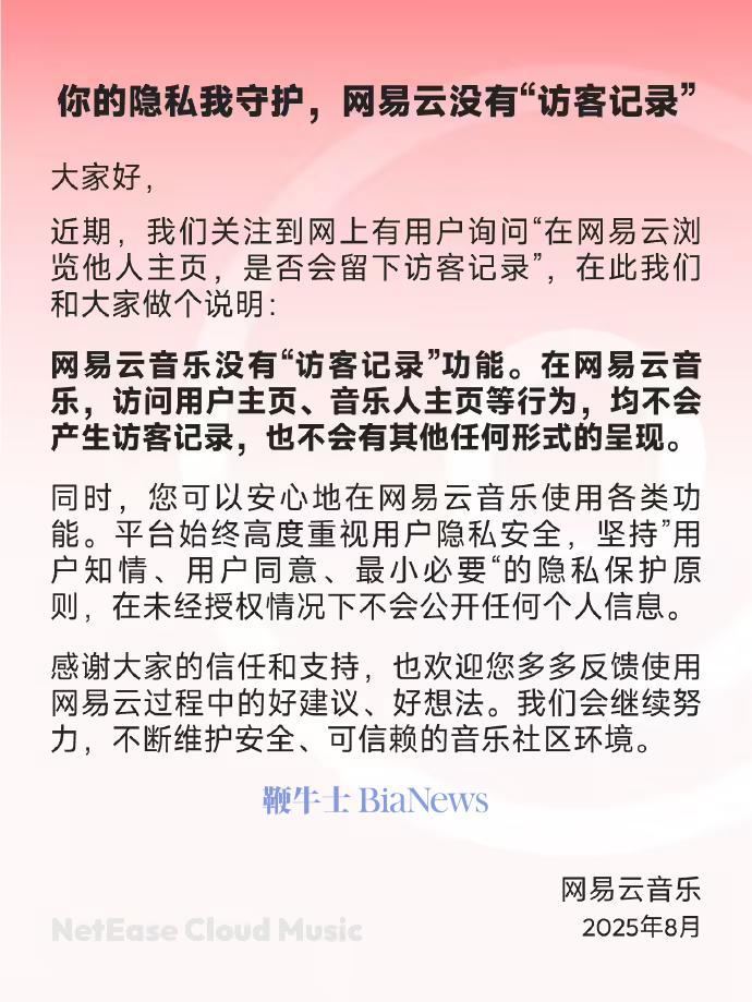网易云音乐:无「访客记录」功能,高度重视用户隐私安全
